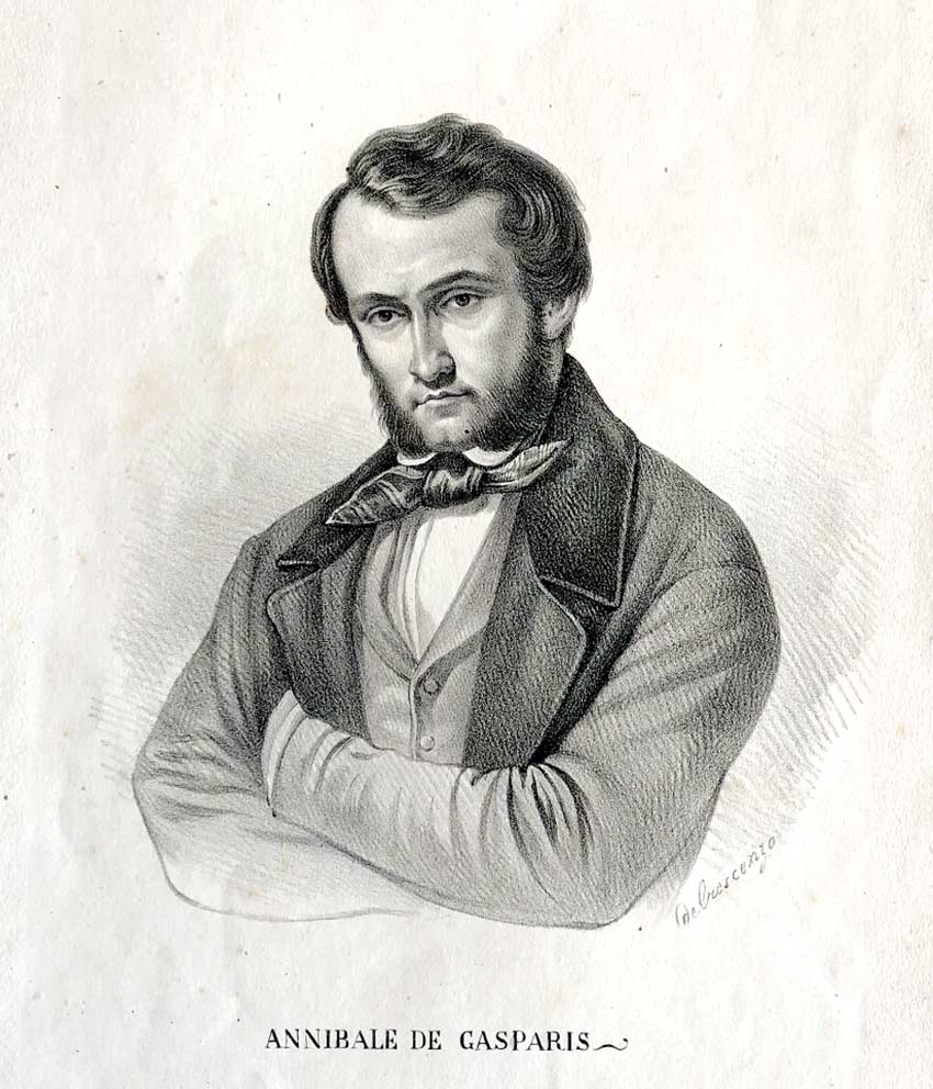 Annibale De Gasparis nacque a Bugnara (AQ) l’8 novembre 1819, figlio di un chirurgo. Completati gli studi si trasferì nel 1838 a Napoli per iscriversi alla Scuola di Ponti e Strade. Nel 1840 iniziò il suo percorso astronomico come “alunno” all’Osservatorio di Capodimonte, dove si stabilì definitivamente.