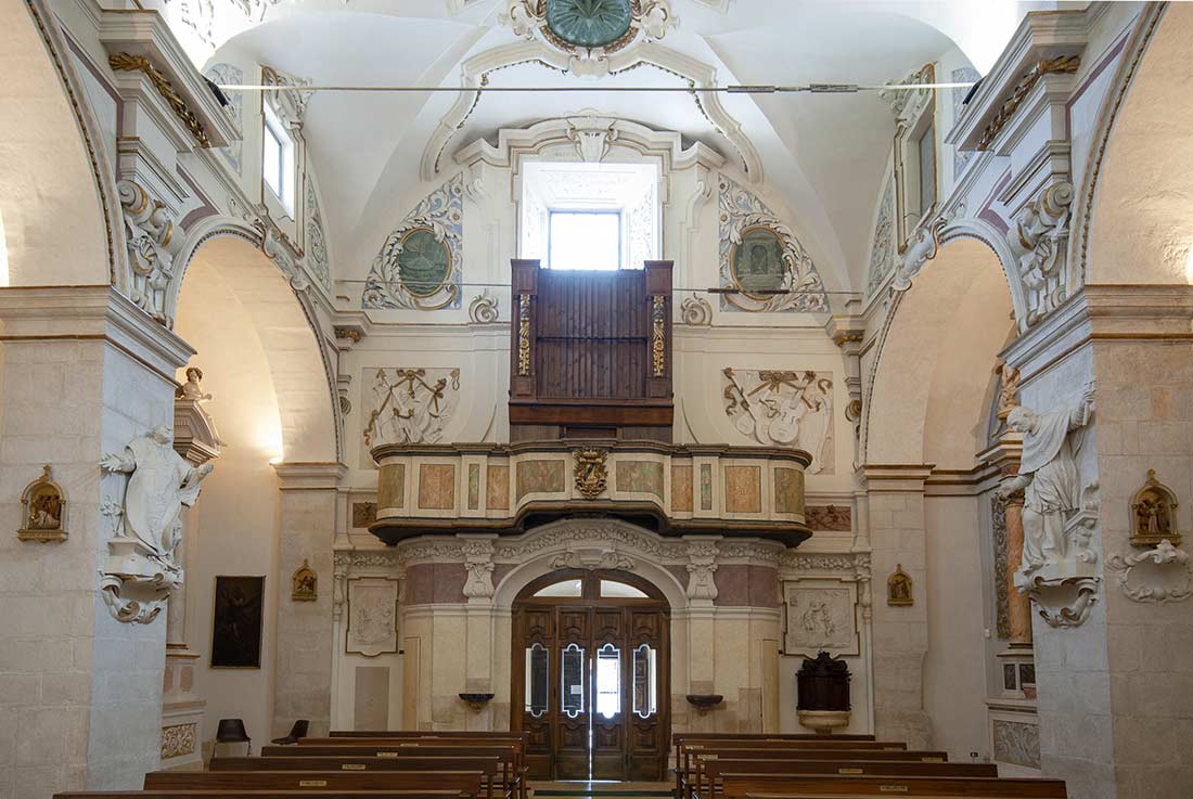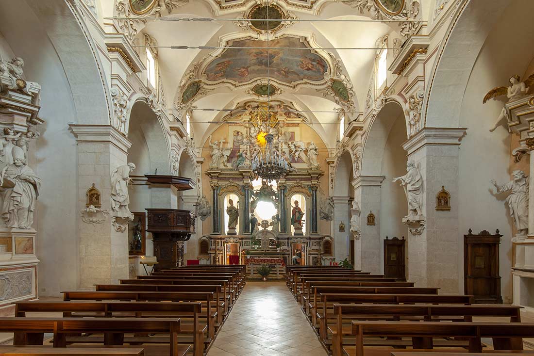 Oltrepassata la soglia, l’interno della chiesa sorprende per la ricchezza decorativa e la teatralità barocca. A navata unica, con otto cappelle laterali, l’edificio presenta una volta a botte affrescata, murature in pietra e una volta in tufo. L’illuminazione è garantita da sette finestre che creano giochi di luce sulle superfici ornate da stucchi e affreschi.