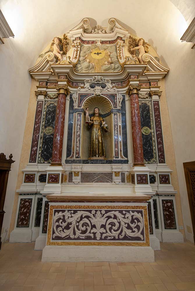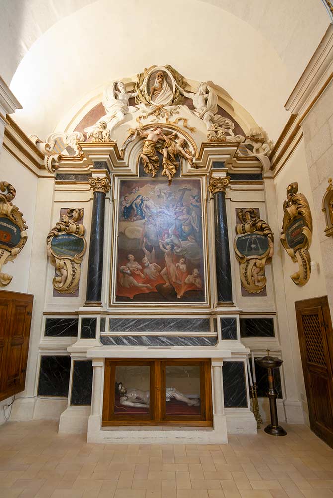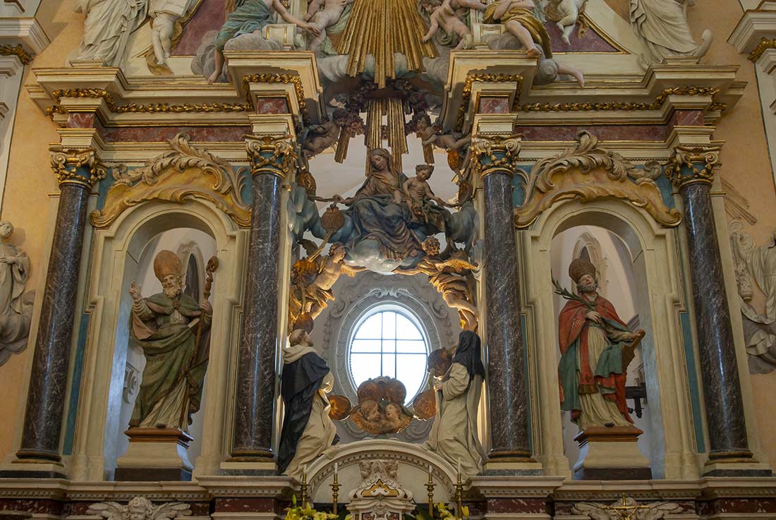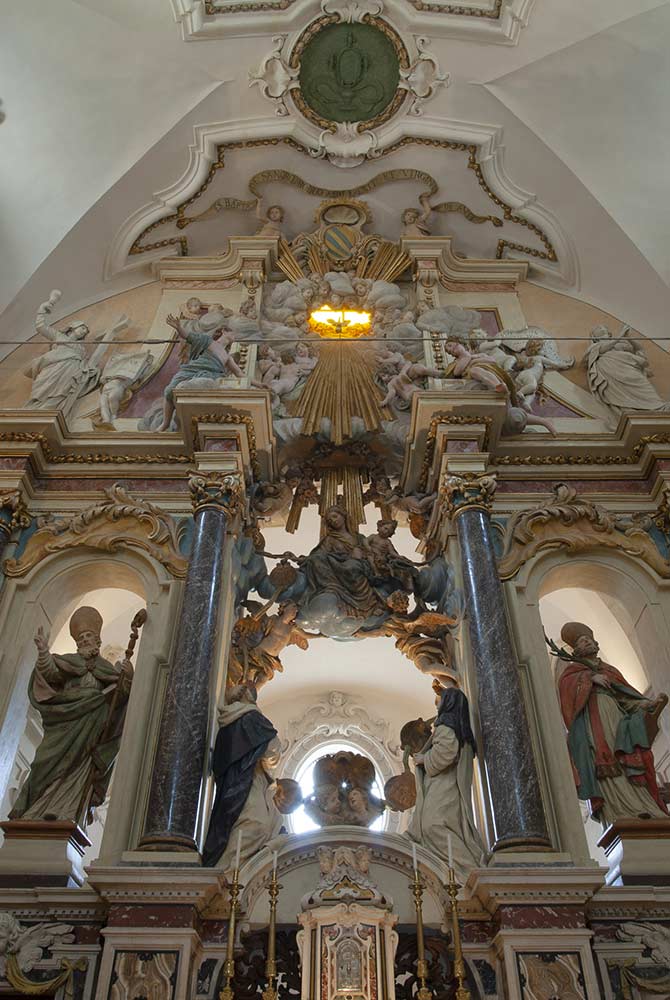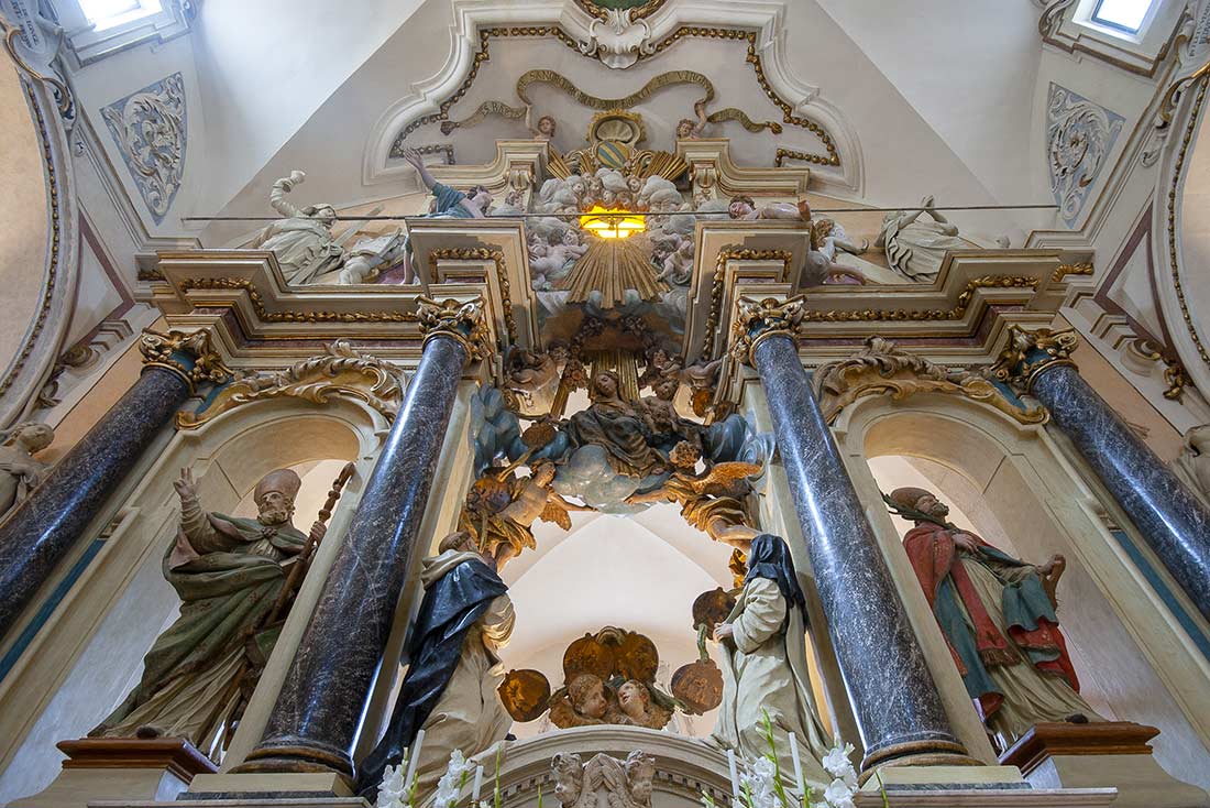 Il vero protagonista è l’altare maggiore, autentico capolavoro scenografico ispirato al "modus berniniano". Realizzato in materiali lapidei, marmo e stucchi traforati, è articolato in tre ordini. Vi si trovano statue di santi, putti e angeli in gloria, e una luce indiretta che richiama la Cattedra di San Pietro a Roma.