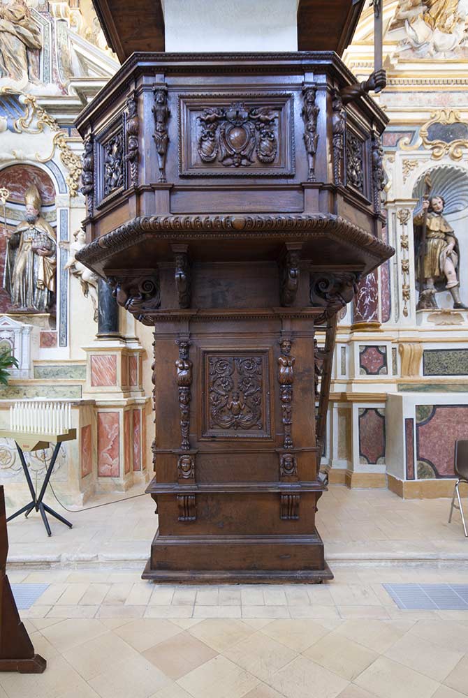 Un elemento raro e di grande fascino è la presenza di statue a grandezza naturale sui pilastri rivolti verso l’aula: santi scolpiti in stucco che sembrano dialogare con i fedeli. Questa caratteristica, inusuale per l’Abruzzo, ha fatto ipotizzare l’intervento di artisti lombardi, forse legati alle botteghe attive in area milanese e coinvolti in numerosi cantieri lungo la via del Sagittario.